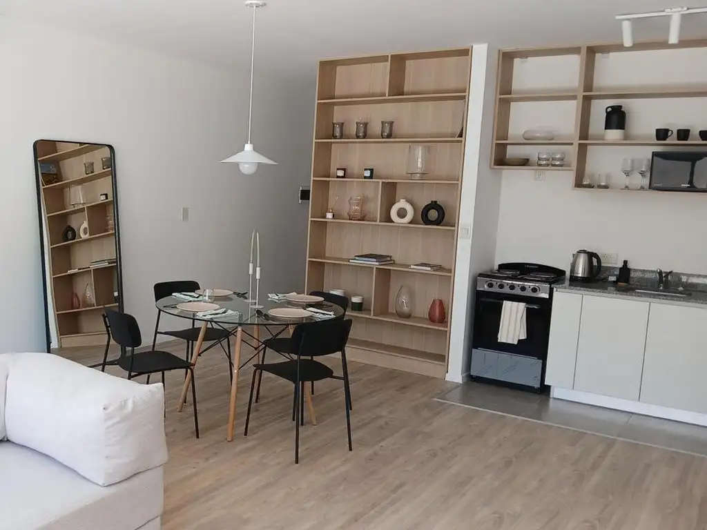 Living comedor luminoso con salida directa a una terraza privada de 21 m², ideal para disfrutar del aire libre y la vista al entorno verde.Cocina integrada tipo americana, equipada con muebles bajo mesada, espacio para lavarropas y grifería de primera línea.Dormitorio principal amplio, con placard empotrado y excelente ingreso de luz natural.Baño completo con terminaciones modernas y de calidad.Además, dispone de calefacción por losa radiante, preinstalación de aire acondicionado, instalación eléctrica subterránea, agua corriente, gas natural, cloacas, internet y cable, garantizando confort y eficiencia.