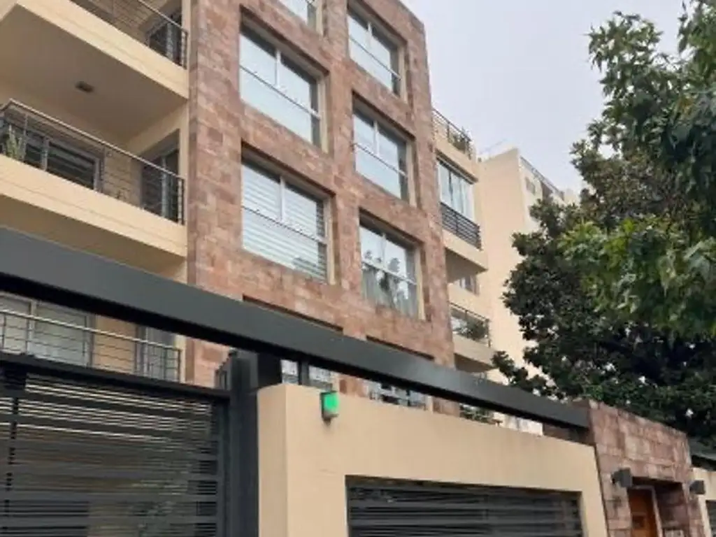 El edificio se compone de dos bloques, el departamento se encuentra en el primer bloque, al frente. Importante hall de recepción con mueble de guardado para sacos y bolsos, pallier privado con puerta de seguridad Pentágono, toallet, living-comedor muy luminoso con pisos de porcelanato y salida al balcón aterrazado, que le confiere una esplendida vista.