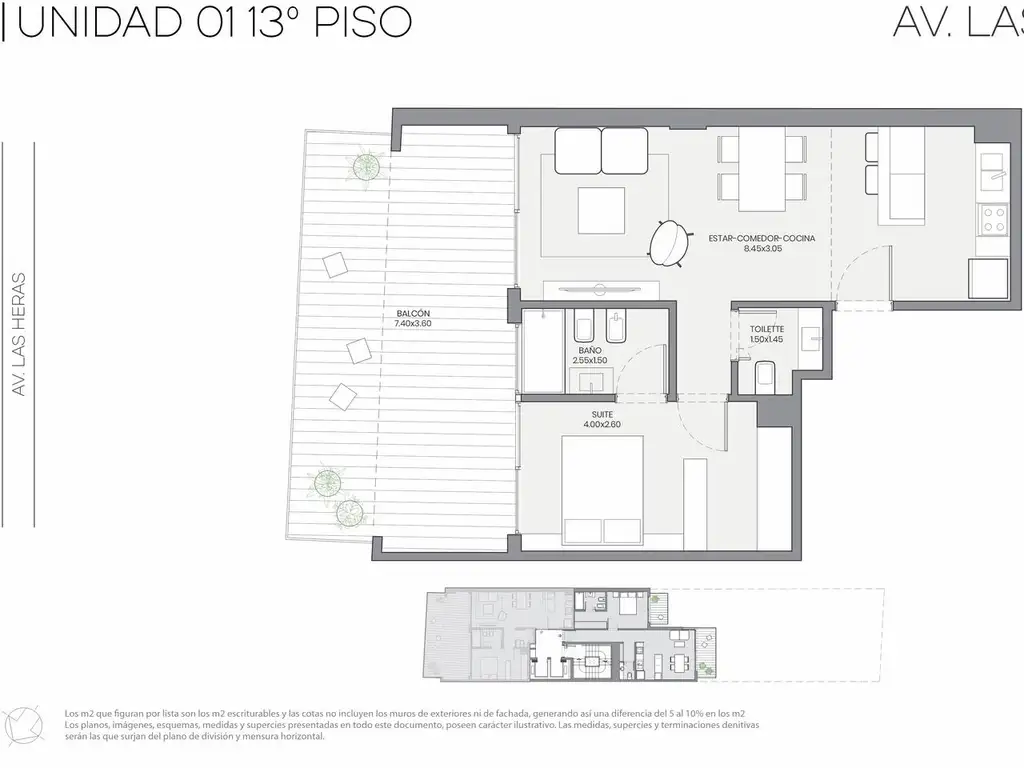 Amplio, luminoso y con ventilación. Living comedor con abertura y DVH, salida a granterraza al frente. Cocina americana con muebles completos y, horno y anafe eléctricos. Hall de distribución. Toilette de recepción. Dormitorio con baño en suite, vestidor y salida a terraza. Instalación preparada para la instalación de lavarropas o lavavajillas. Equipos de aire frio/calor sistema invertir de alta eficiencia energética. Agua caliente central. Ideal para alquiler temporario. Con cerradura electrónica, pisos de porcelanato, cielorraso hormigón visto y en baño de yeso. Los muros internos y divisorios son de ladrillo.