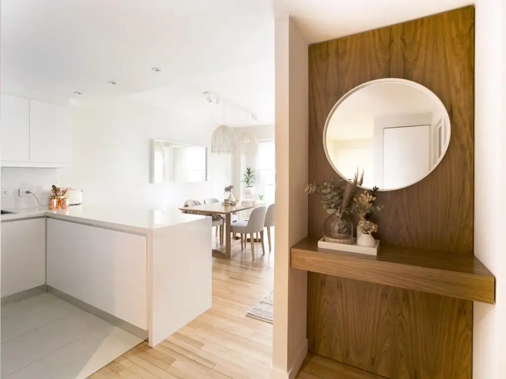 Se ingresa a la unidad por un pasillo recibidor que comunica los ambientes del Living-comedor con cocina integrada y la salida al balcón al frente; y al dormitorio con vestidor y baño en suite con gran bañera. La amplitud del dormitorio permite incluir un espacio para escritorio y mucho lugar de guardado. Cuenta con AA y con losa radiante para calefaccionar todos los ambientes.
