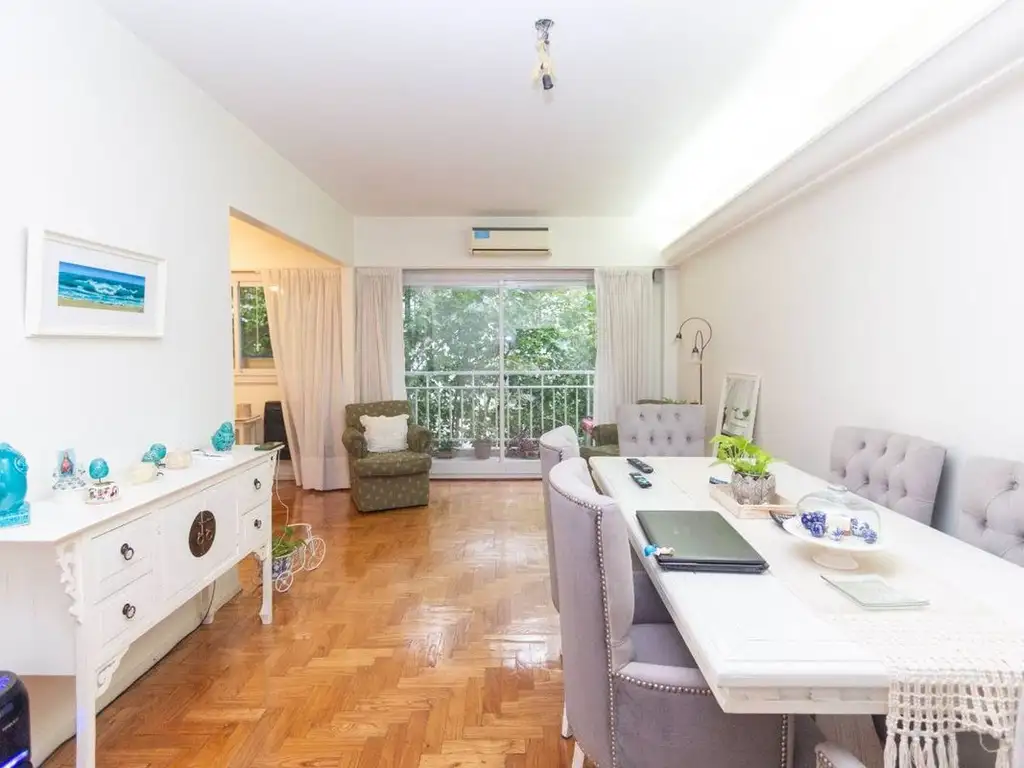 Al ingresar al departamento, te recibe un amplio y luminoso living comedor, con pisos de parquet que aportan calidez al ambiente. Este espacio se destaca por sus generosas dimensiones y cuenta con salida a un balcón corrido al frente, donde los pisos de granito añaden un toque de elegancia.