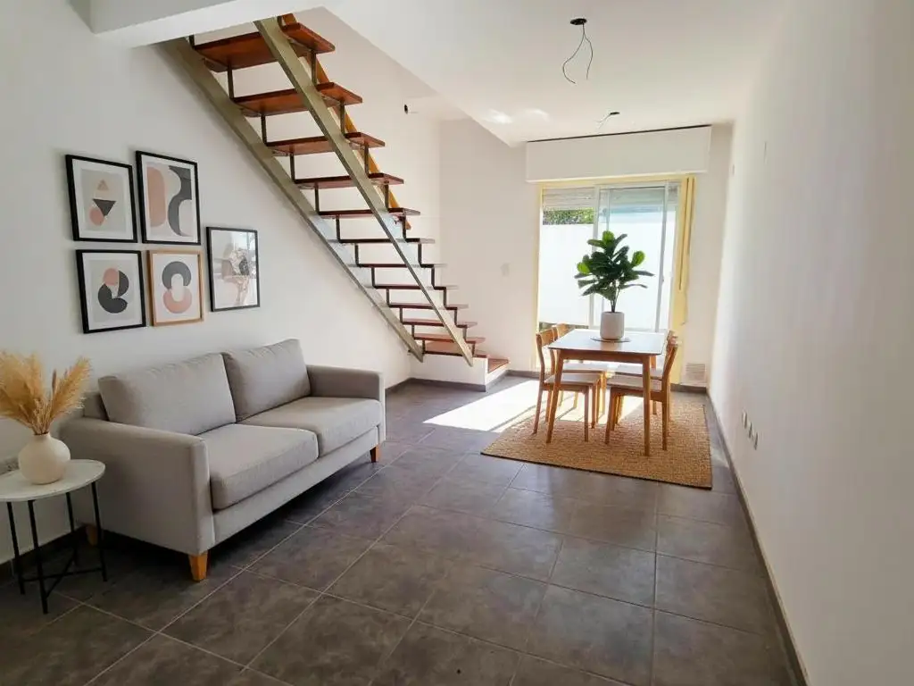 La unidad se encuentra en el piso 3 por escalera. Posee el ingreso a la cocina integrada, baño completo y living comedor con salida a patio exclusivo. Desde el living comedor accedemos a través de una escalera al dormitorio, el cual tiene salida al espacio de terraza exclusiva más pequeña. La disposición de la unidad es contrafrente, con orientación norte. Muy luminosa. Unidad a estrenar.