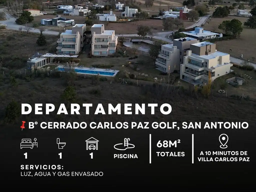El departamento se ubica en primer piso de un complejo privado en el Country Carlos Paz Golf; Barrio cerrado con seguridad privada, cancha de golf, club house, y muchas más comodidades que lo hacen una excelente opción para vivienda y renta turística, por su rápido acceso a Córdoba por la variante de Las Jarillas.