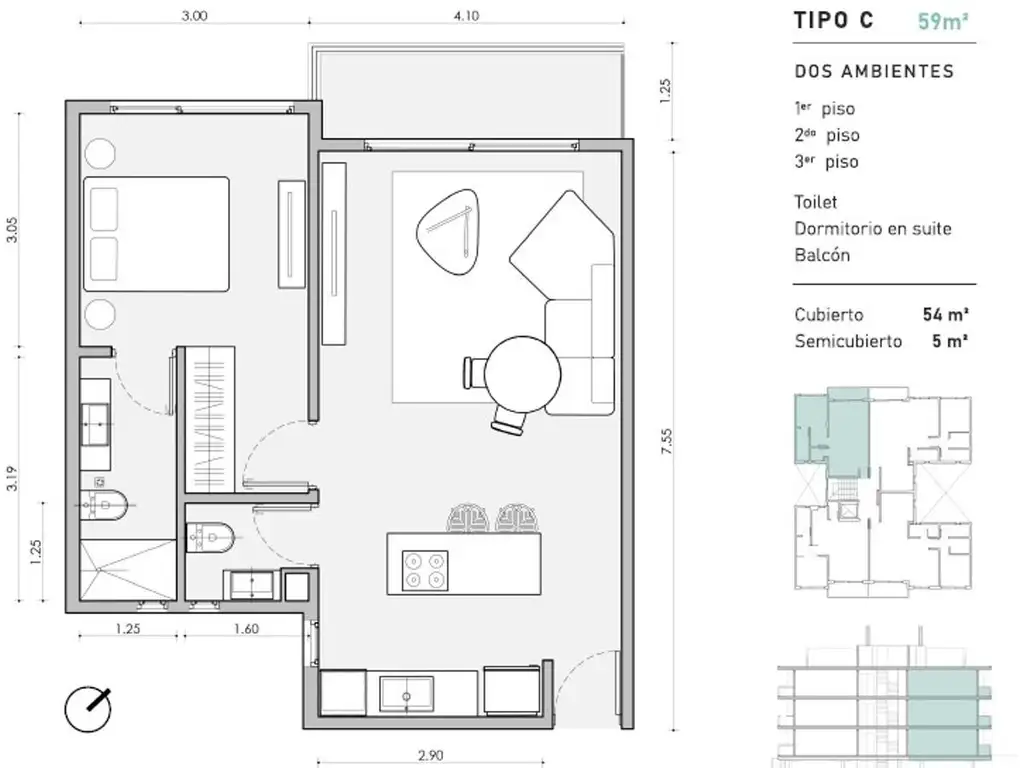 Superficie: cubierta 54m2 y semicubierta 5m2 (balcón).
