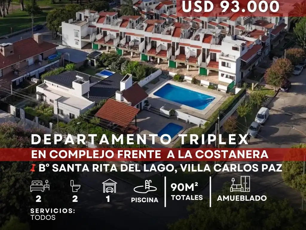 Se ofrece a la venta departamento tríplex ubicado en complejo residencial del barrio Santa Rita, sobre la costanera del Lago San Roque, rodeado de naturaleza, actividades recreativas y con gran potencial de renta turística.