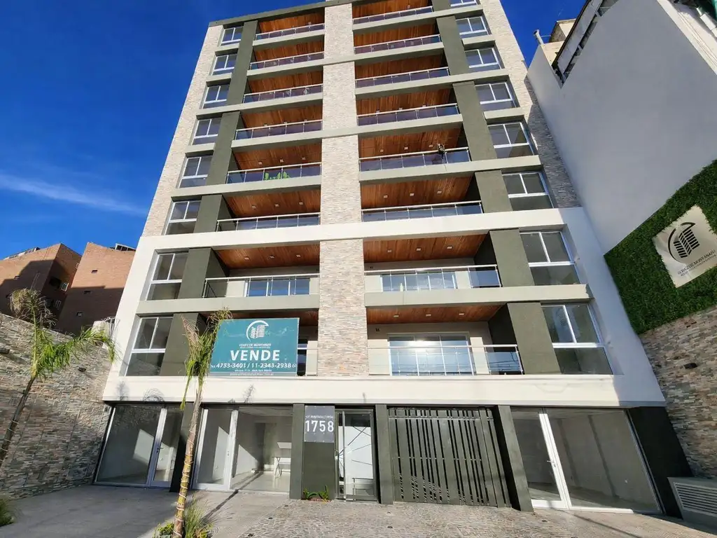 Departamento 2 ambientes al frente con doble balcon aterrazado, cuenta con living comedor, cocina integrada con mueble bajo mesada y alacena, baño completo, dormitorio, 2 balcones, 1 aterrazado al frente y el segundo al contrafrente con parrilla propia.