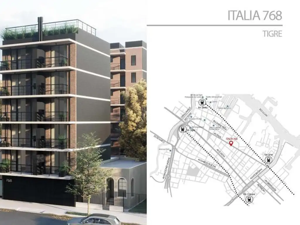 Ubicado estratégicamente sobre la Avenida Italia, en Tigre, este moderno edificio se integra armónicamente con el espacio público gracias a su planta baja libre, generando una conexión visual y funcional con el entorno.