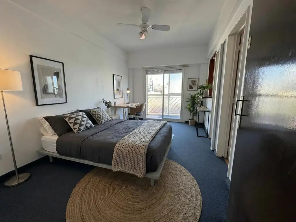 El ambiente principal es cómodo y funcional, con salida al balcón. La cocina cuenta con barra desayunadora, ideal para optimizar el espacio. Dispone de baño completo y agua caliente por termotanque eléctrico.