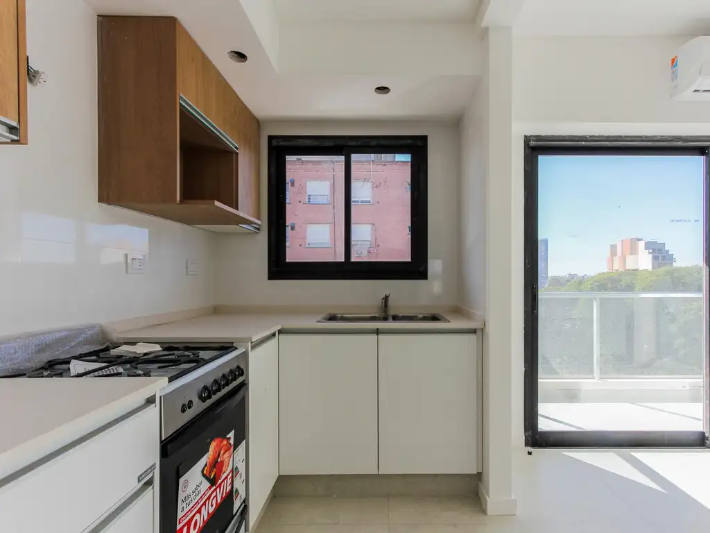 La unidad cuenta con un amplio y luminoso living-comedor con cocina semi integrada, equipada con muebles bajo mesada y alacena.