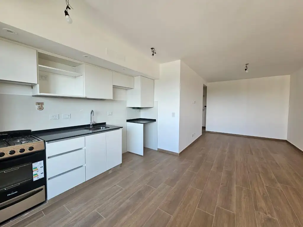 Luminoso y amplio ambiente divisible con cocina integrada, muebles completos altos y bajos. Gas natural. Agua caliente por termotanque eléctrico.