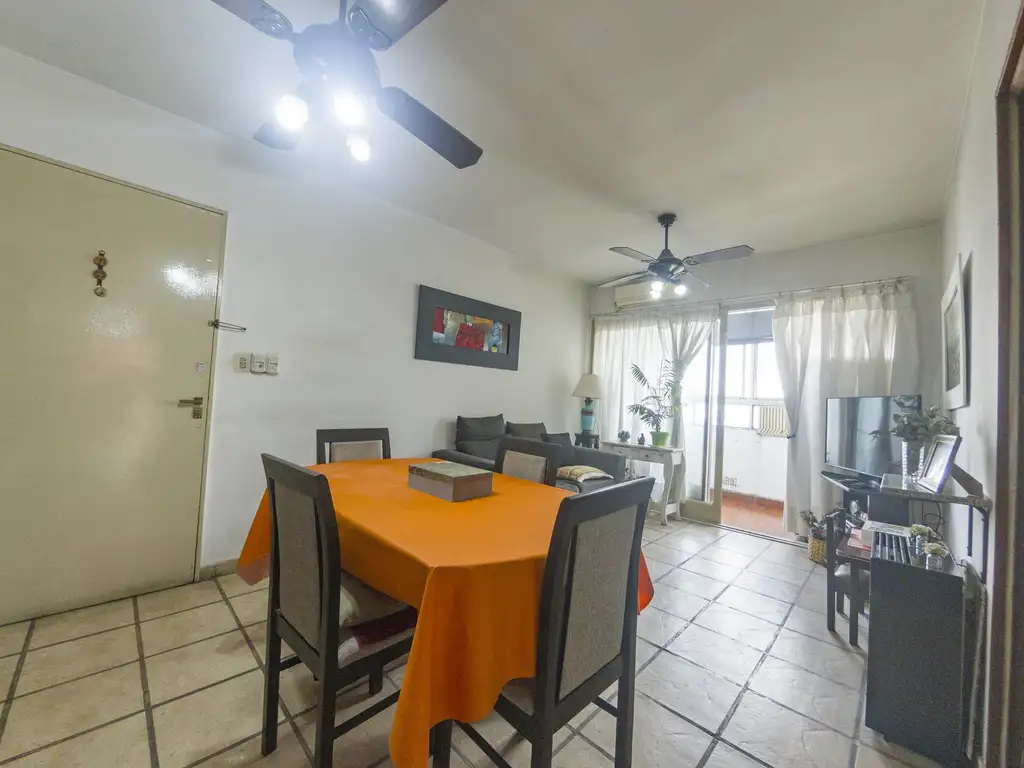 Los dos dormitorios tienen placard de piso a techo, con buen espacio de guardado, ventilador y ventanas al exterior con vista abierta. La cocina tiene horno cocina a gas, calefón, y muebles de melamina en altura y bajo mesada. El living comedor continúa hacia el balcón cerrado con amplios ventanales, vista panorámica de la ciudad, buena iluminación y ventilación. El baño completo está adaptado para personas mayores, con fácil acceso a la ducha y barandal de agarre cerca del inodoro.