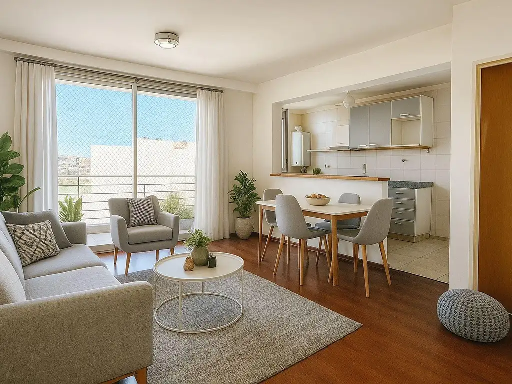 Cuenta con living-comedor con piso flotante, barra desayunador y cocina integrada a gas equipada con muebles bajo y sobre mesada.