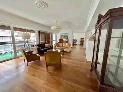 Hacia la derecha del living, accedemos al comedor principal. Hacia la izquierda del living se encuentra un imponente escritorio. Tanto el escritorio living y comedor se comunican por un amplio balcón corrido que da al frente del edificio, sobre la calle posadas. Todos los pisos tarugados.