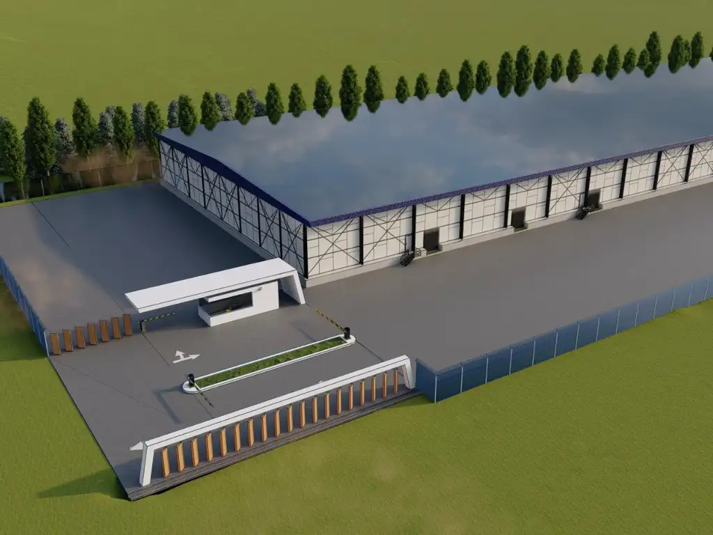 El inmueble se esta construyendo sobre una Fracción de 27.300 m2 y va a contar con una superficie total edificada de 15.000 m2, 12 Docks carga y descarga con plataformas y playa de maniobras; Baños vestuarios y oficinas a convenir. Techo de chapa con una altura de 12 metros.