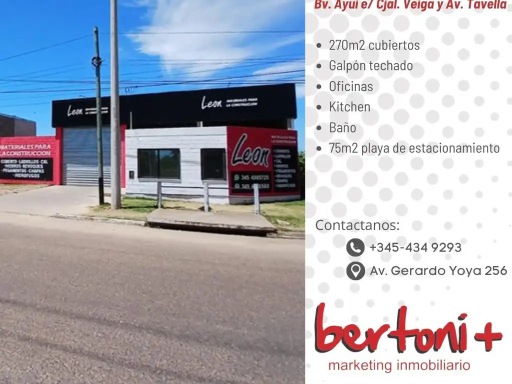 250 m² cubiertos, distribuidos entre: Nave, Local Comercial, Oficinas, Playa de estacionamiento, Playón descubierto. Baños, Kitchenette.