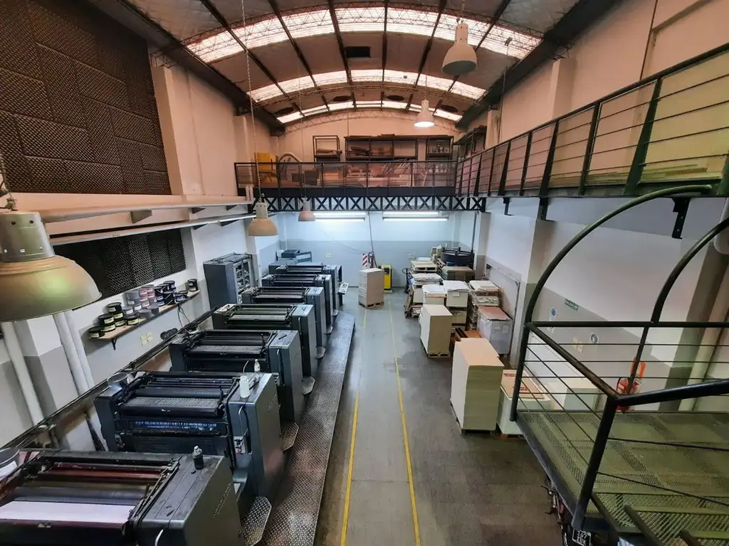 El galpon cuenta con: Local de recepción a la calle con frente vidriado, 5 oficinas, 4 baños dos de ellos con vestuario, cocina, deposito, montacargas, terraza, quincho y estacionamiento.