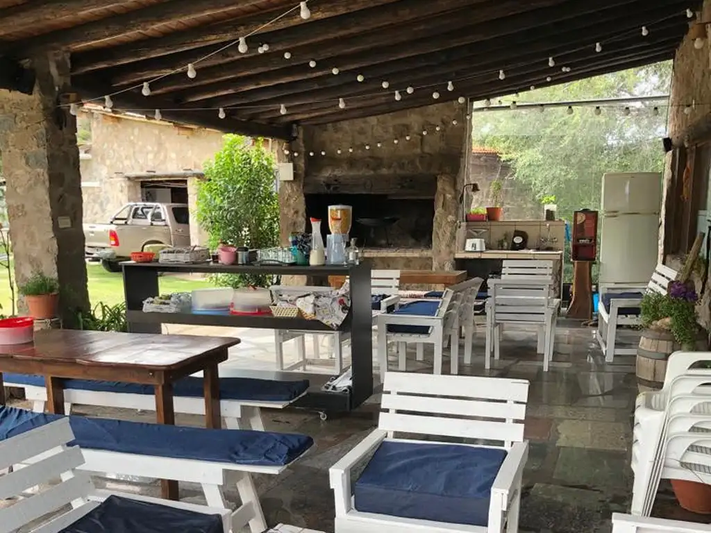 Cuenta con vivienda para el propietario con 2 dormitorios con placares, baño, cocina comedor integrado con estufa hogar, rodeado de ventanales con vidrios fijos, galería asador, cochera para 3 autos, todo realizado en piedra, emplazado en media hectárea, rodeada de montaña.
