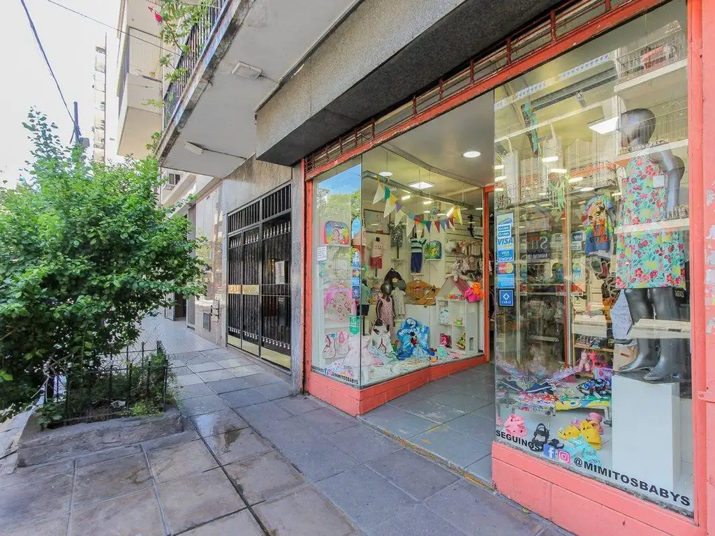 Actualmente funciona una tienda de ropa infantil, antiguamente se confeccionaba la ropa en el sótano y se vendía en el salón de PB. La disposición permite facilidades para distintos rubros y la ubicación promete flujo constante de clientes.