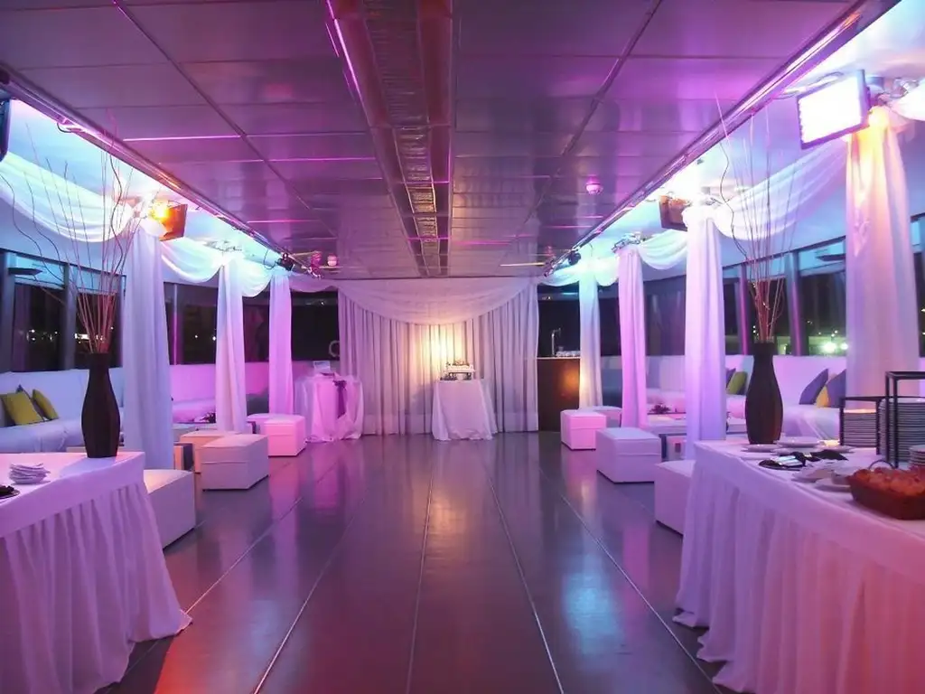 Hermoso Catamaran, preparado para Salón de Eventos, Restaurante, Bar, de 24,80 mts der Eslora (Largo), por 8 metros de manga (ancho). 160 mts cuadrados de local utilizables en planta baja y unos 100 metros cuadrados utilizables en Cubierta Superior. Totalmente preparado para Eventos. Posee 2 motores Principales Detroit V8 Diesel, Potencia total 484 KW, 2 Perkins 6 , Generadores de 60 KW cada uno. Capacidad, 280 Personas incluido el Personal de Servicio.. 2 baños en Salon Principal de dos inodoros cada uno y lavabos, 1 baño en cubierta Superior. Cocina y anafe de 4 hornallas Electricas, 2 Hornos Electricos, dos microondas, 1 freezer, 2 heladeras exhibidoras, 1 frigobar, heladera bajo mesada de 2 puertas. Todo funcionando