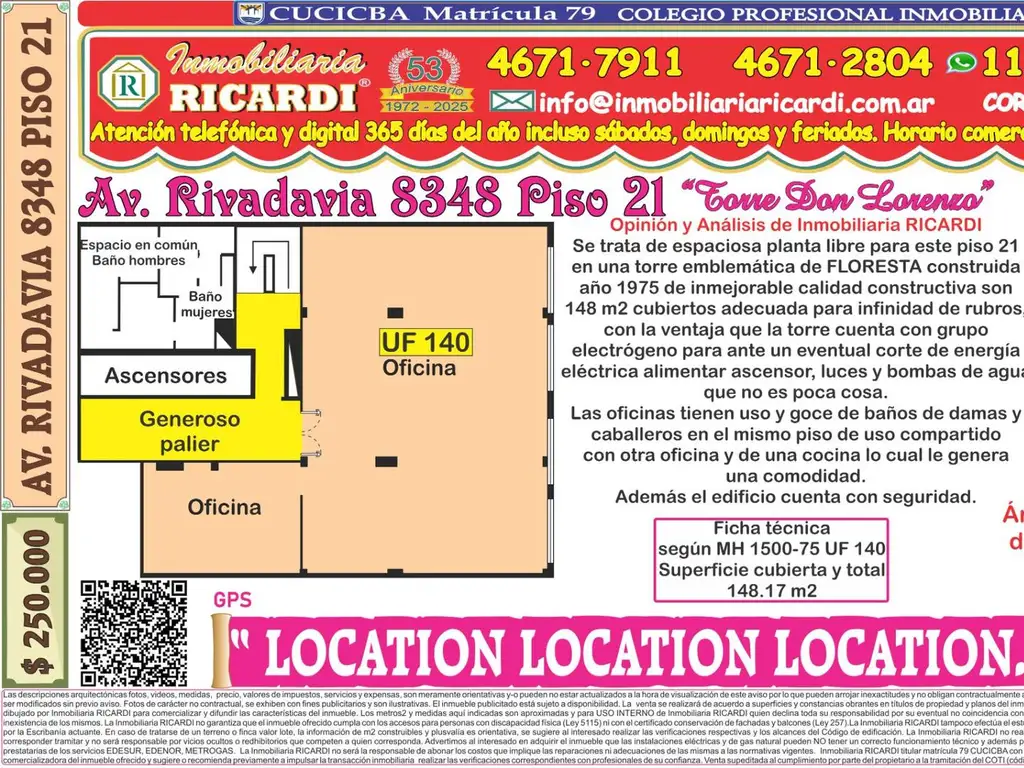 Con una mirada indulgente podemos comentar que se trata de una planta libre EXCEPCIONAL en el piso 21 en una torre emblemática de FLORESTA construida en el año 1975 de inmejorable calidad constructiva son 148 m2 cubiertos adecuada para infinidad de rubros, con la ventaja que la torre cuenta con grupo electrógeno para ante un eventual corte de energía eléctrica alimentar ascensor, luces y bombas de agua que no es poca cosa.