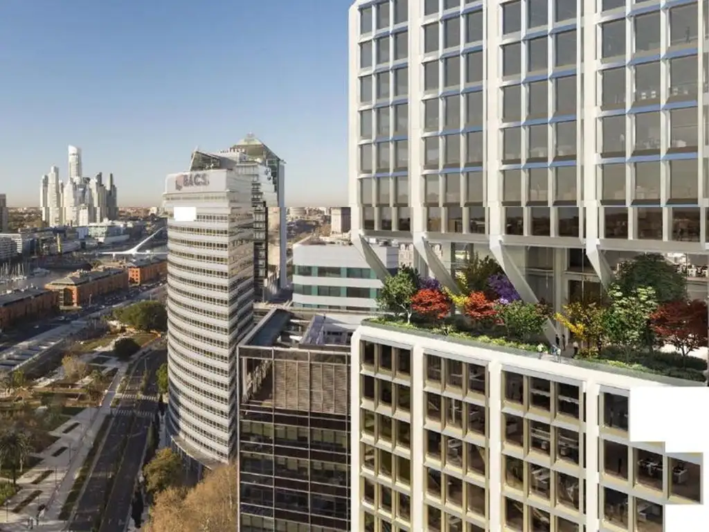Las oficinas se entregan terminadas con aire acondicionado VRV/VAV acopiado, piso técnico acopiado, baños completos, cielorraso colocado en el perímetro, sprinklers y detectores de humo acopiados