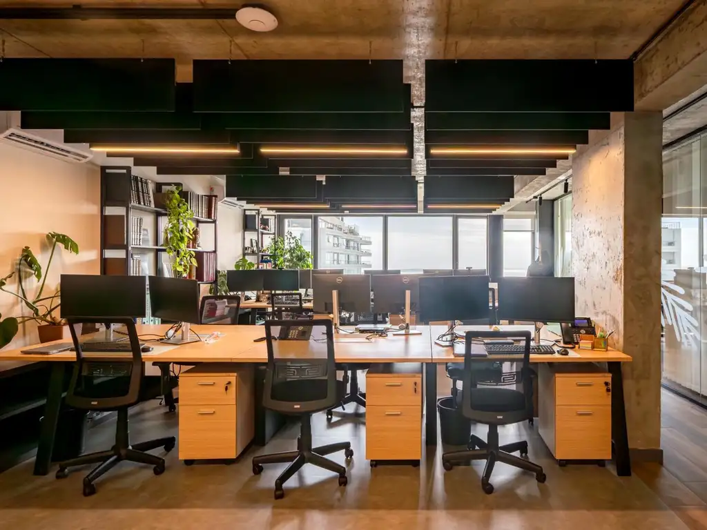 Cuenta con una amplia sala de reuniones, una oficina privada cerrada y un sector de trabajo con capacidad para doce personas. Dispone de placas de insonorización, aire acondicionado y una cocina de generosas dimensiones con espacio para almuerzo.