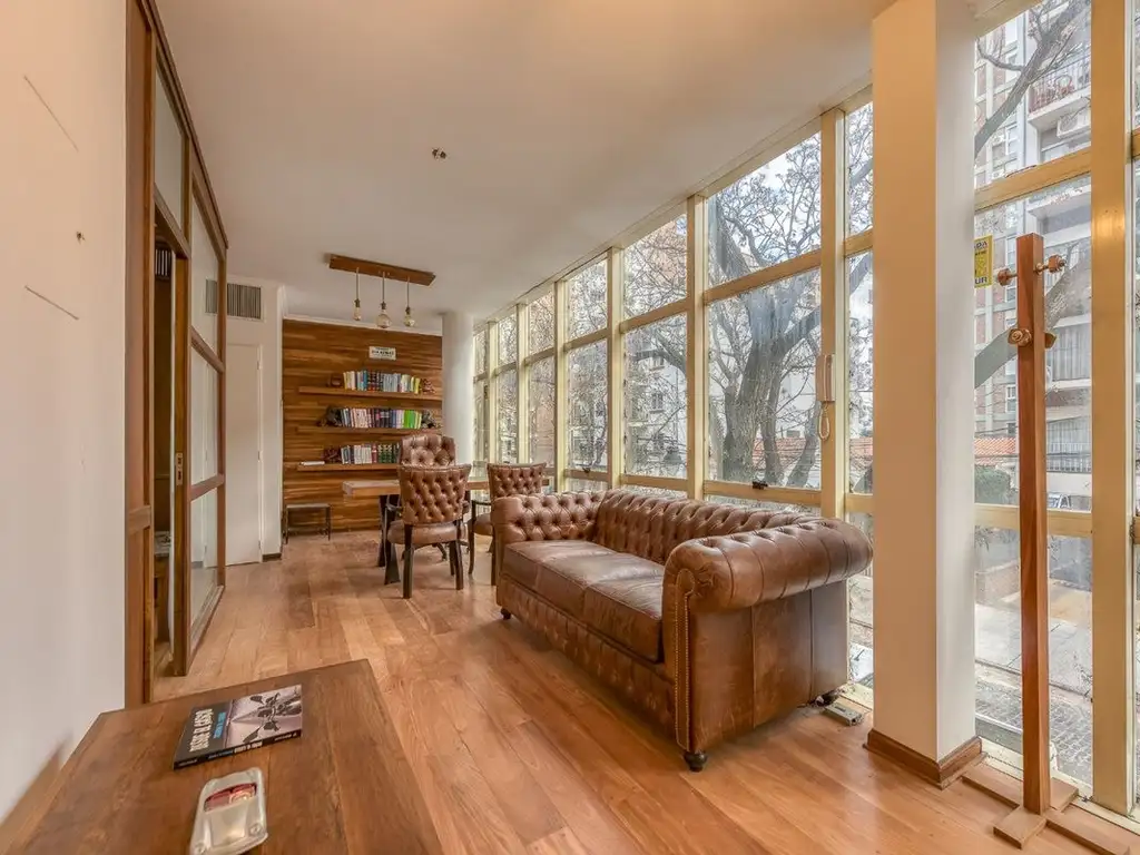 El edificio cuenta con frente vidriado tanto hacia la calle como hacia el pulmón, el cual posee un jardín interno. Son tres oficinas por piso, en un edificio de planta baja y tres niveles. Además, dispone de una terraza de uso común con baño.