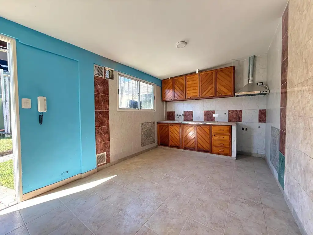 El living comedor con cocina integrada es amplio y luminoso, con pisos cerámicos claros que aportan frescura y fácil limpieza. La cocina está equipada con mueble bajo y alto mesada de madera, mesada de granito, artefacto de cocina a gas y spar, además de contar con buena ventilación natural gracias a sus aberturas al exterior. Este ambiente se convierte en el corazón del hogar, con espacio suficiente para comedor diario.