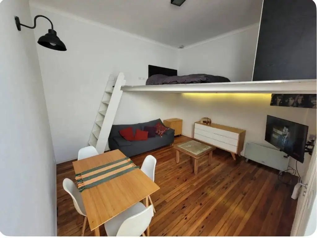 El ambiente principal es amplio y luminoso, con techos altos lo que permite un entrepiso para dividir la habitación con placard y espacio para una cama de 2 plazas; y abajo un living/comedor espacioso de buenas dimensiones.