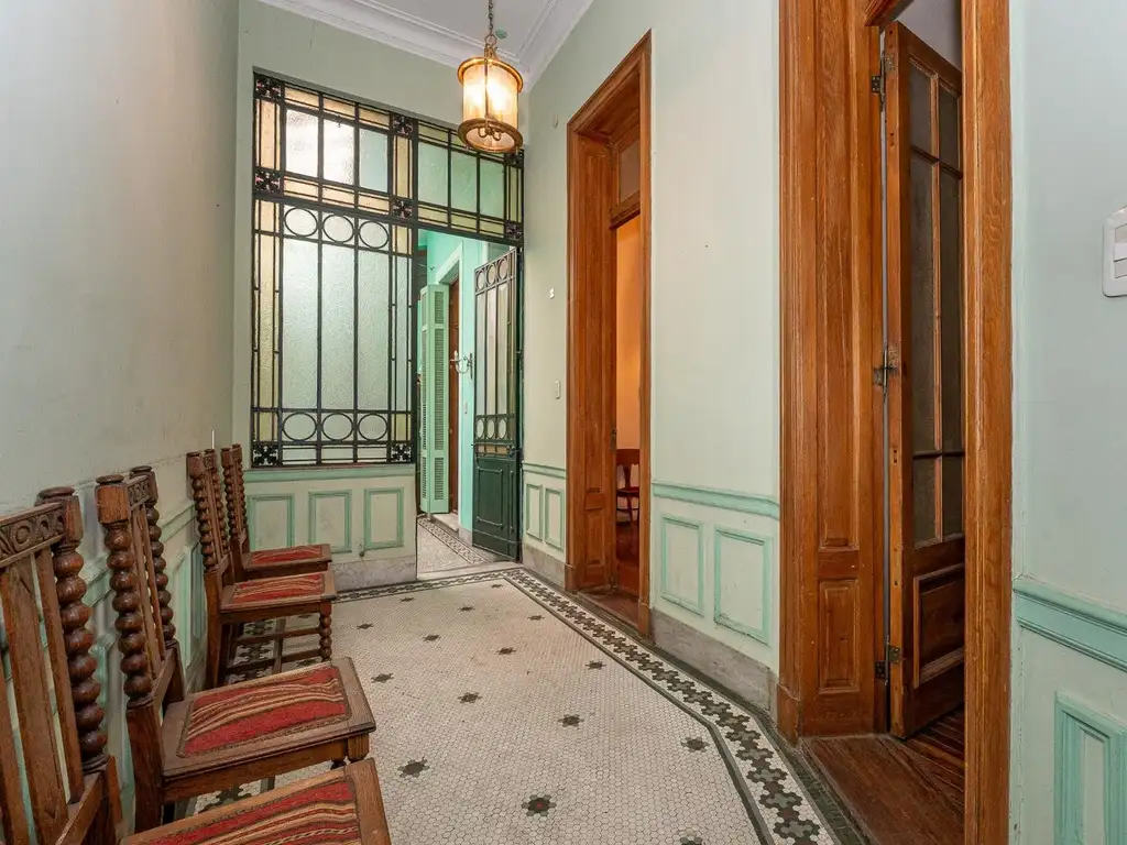 Con 106 m², la propiedad conserva detalles de época como sus pisos de pinotea, carpinterías de madera y los vitrales en las aberturas, generando un ambiente único de serenidad y estilo. El hall de entrada, con sus detalles arquitectónicos, marca el carácter de la casa, mientras que el patio central techado se convierte en el corazón de la propiedad, dando vida a cada ambiente.