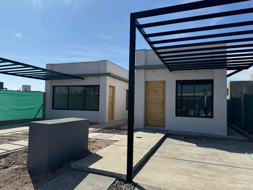 DESCRIPCION: La propiedad está distribuida en una sola planta y consta de ingreso principal a un amplio living comedor, cocina equipada e integrada al living comedor. Pasillo intimo con dos dormitorios amplios con placares, baño completo. Cochera para un vehículo. Jardin parquizado con churrasquera.