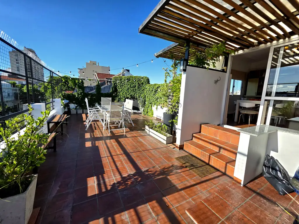 - Amplia terraza al frente (8,5x4,3 aprox) con parrilla (herrería completa), pérgola y mesada.