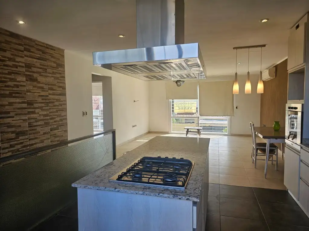 COCINA CON ISLA Y AMOBLAMIENTOS MODERNOS Y DE BUENA CALIDAD. GRANDES VENTANALES AL FRENTE Y AL CONTRAFRENTE, OTORGANDO VENTILACIÓN PASANTE. LOS ESPACIOS INTEGRADOS, ESTÁN DIFERENCIADOS POR TIPO Y ESTILO DE PORCELANATO QUE REVISTE SUS PISOS.
