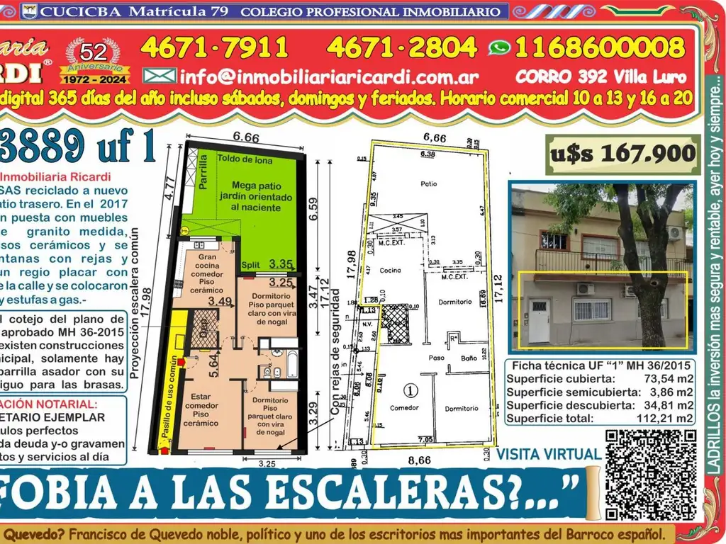 La Inmobiliaria RICARDI NO garantiza que el inmueble cumpla con el certificado de conservación de fachadas y balcones (Ley 257) tampoco efectúa el estudio de títulos, ni analiza los alcances del Código de edificación y no será responsable por los vicios ocultos o redhibitorios que competen a quien corresponda. Advertimos al adquirente que las instalaciones eléctricas, de gas natural y-o sanitarias pueden NO solo no tener un correcto y adecuado funcionamiento técnico sino que además puede NO cumplir con las exigencias actuales de METROGAS- EDESUR- EDENOR - siendo a cargo del adquirente que implique su puesta en valor y-o funcionamiento.