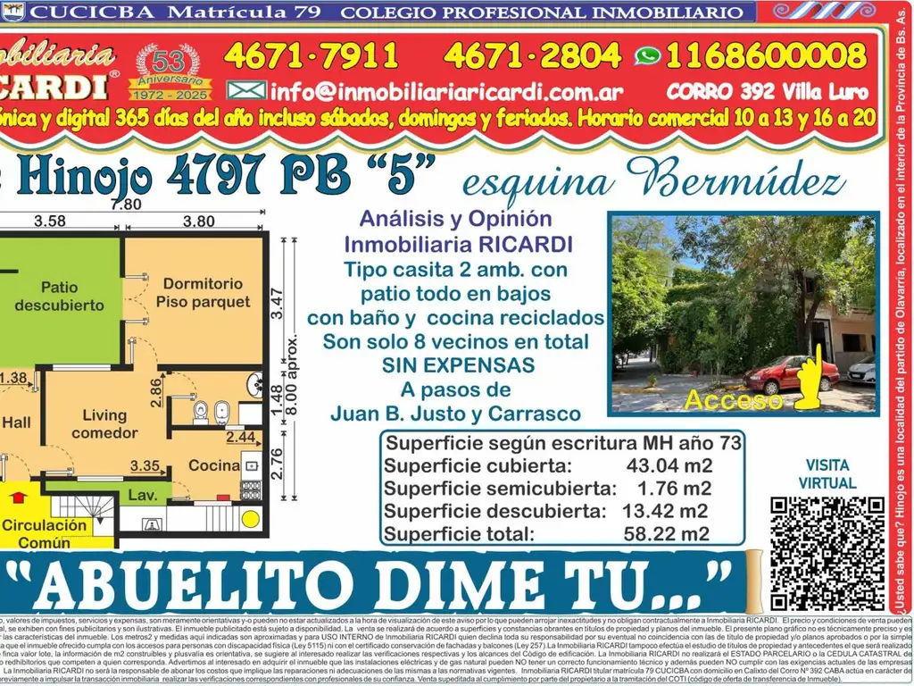 El inmueble publicitado se encuentra está sujeto a disponibilidad y la Inmobiliaria RICARDI actúa como comercializador del inmueble., siendo bajo responsabilidad del propietario la tramitación del COTI.
