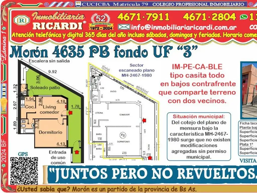La Inmobiliaria RICARDI NO garantiza que el inmueble cumpla con el certificado de conservación de fachadas y balcones (Ley 257) tampoco efectúa el estudio de títulos, ni analiza los alcances del Código de edificación y no será responsable por los vicios ocultos o redhibitorios que competen a quien corresponda. Advertimos al adquirente que las instalaciones eléctricas, de gas natural y-o sanitarias pueden NO solo no tener un correcto y adecuado funcionamiento técnico sino que además puede NO cumplir con las exigencias actuales de METROGAS- EDESUR- EDENOR - siendo a cargo del adquirente que implique su puesta en valor y-o funcionamiento.