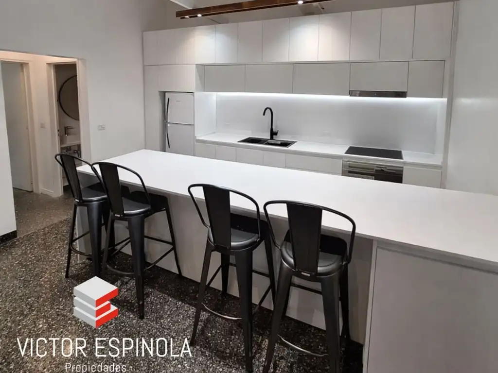 La cocina, de estilo súper moderno, se integra al ambiente mediante una barra desayunadora, equipada con mesada de Silestone y artefactos de primera categoría, ideal para quienes valoran el diseño y la funcionalidad.