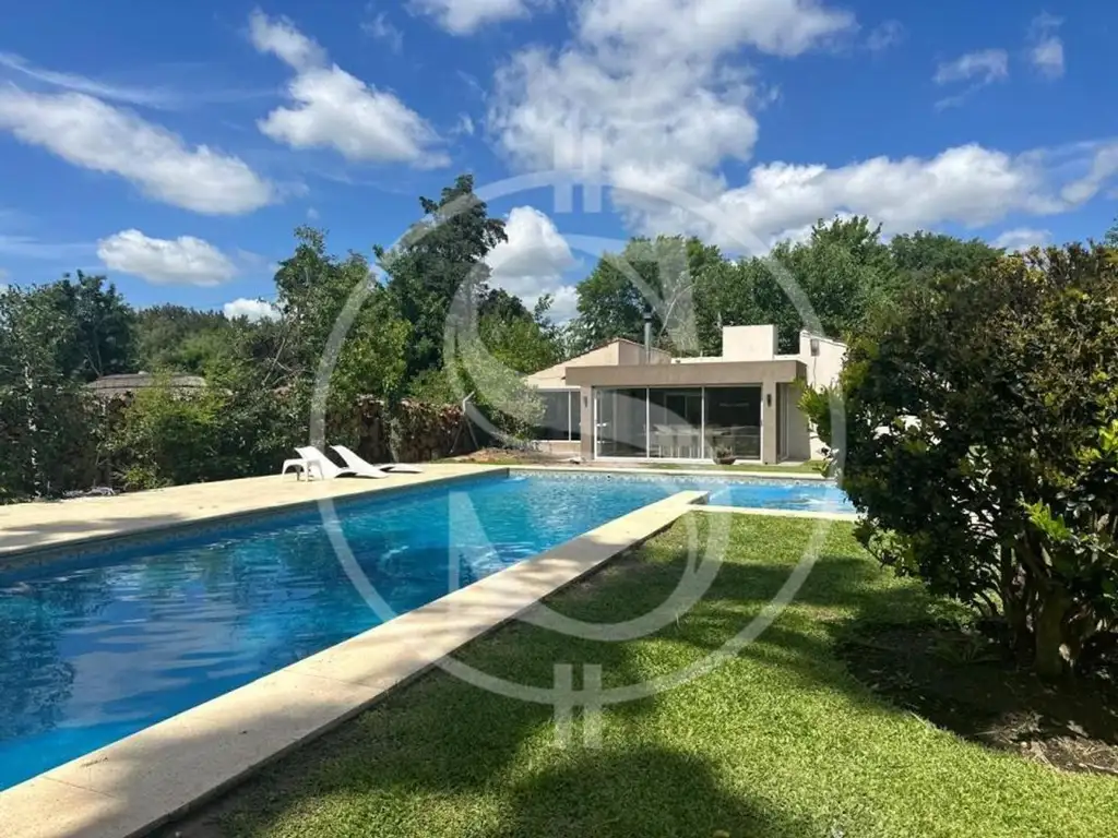Parque con Quincho exterior semi cubierto de 8m x 4.5m. Fogón, sector juego para niños y pileta de 12m x 4m más sector espejo de agua. Mesa exterior de cemento con bancos.
