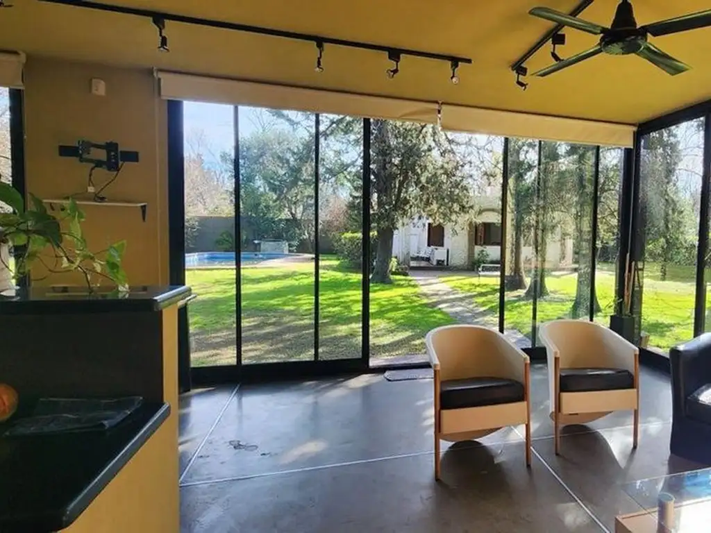 En el exterior se destaca la pileta y un amplio quincho, ubicado de manera estratégica, ya que gracias a sus ventanales ofrece una inmejorable vista tanto de la piscina como del extenso parque que lo rodea. Además, dispone de parrilla y una isla con lavabo que organiza el espacio en dos sectores: de un lado, el comedor; y del otro, un área de relax. A un lado del quincho se suma un horno de barro con una gran mesada de trabajo, ideal para reuniones familiares y gastronómicas.