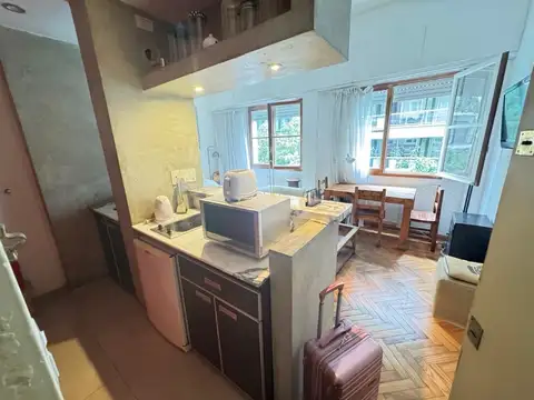 Terraza exclusiva, con parrillero, sillas y mesa con sombrilla.Un ambiente estudio con aire acondicionado, futton/cama matrimonial, con baño en suite completo.