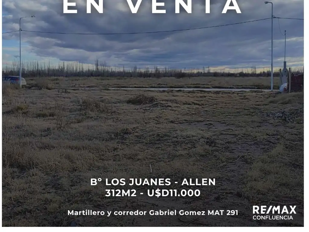Remax Confluencia vende en exclusiva Lote de 312 m2 (12,5m x 25m) en Barrio Los Juanes, Localidad de Allen, RN. UF 14