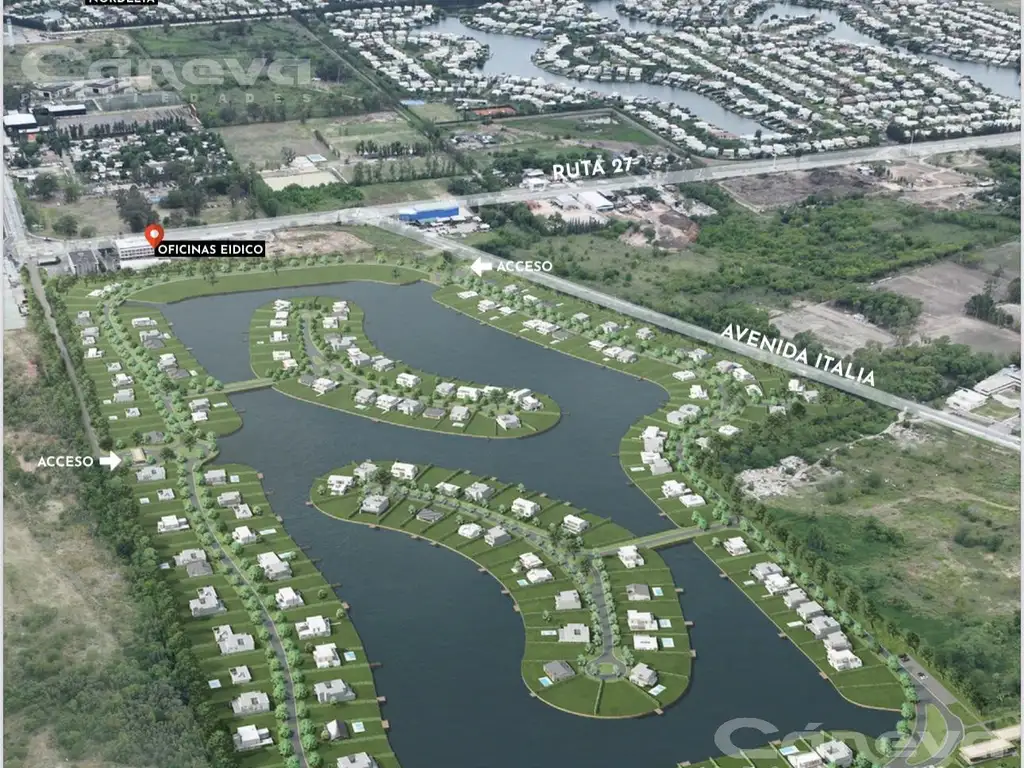 45 ha, 276 lotes y una laguna de 14 ha con islas y puentes.