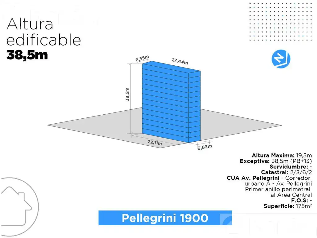 -Ubicación: Sobre Av. Pellegrini , entre calles Moreno y Dorrego. Centro de Rosario.-Tipología: Lote de terreno apto desarrollo -Altura Edificable: 38,5 mts (PB + 13)-Orientación: Norte-Frente 6,73mts-Lindero Este: 26,11mts-Lindero Oeste: 27,44mts-Contrafrente: 6,55 mts-Superficie total: 175 m2-Observación: No es PH