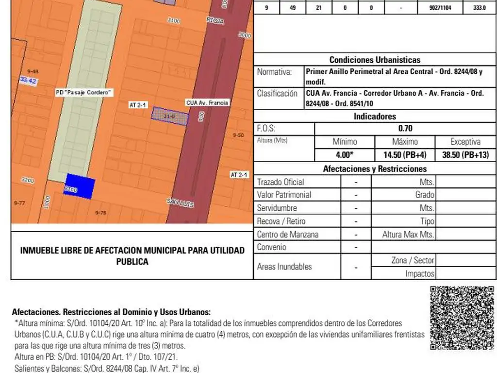 TERRENO DE 10.39 X 32.04 = 332.89M2CUA (corredor Urbano A): altura mínima 4m, altura máxima exceptiva 38.50m (PB + 13 pisos) (máxima no exceptiva 14.50 PB +4 pisos)