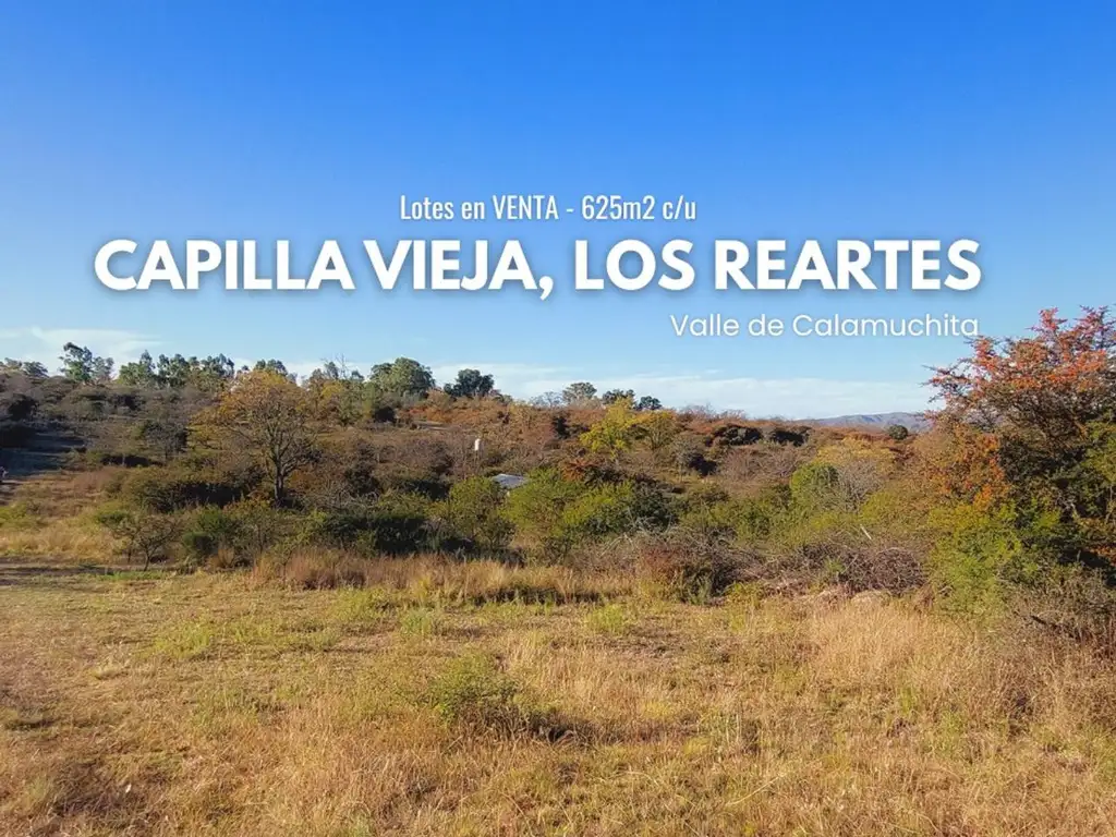 Lotes de 625m2 en venta con escritura, hay 4 disponibles que colindan entre sí. Están ubicados en Capilla Vieja, Los Reartes, en el Valle de Calamuchita, a solo 15 minutos de Villa General Belgrano, a 5 minutos del río Los Reartes y a 15 minutos del Lago Los Molinos.