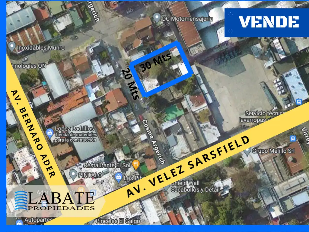 Doble lote de 600 mts2 en Munro, a media cuadra de Av. Velez Sarsfield y a una cuadra de Av. Bernardo Ader.