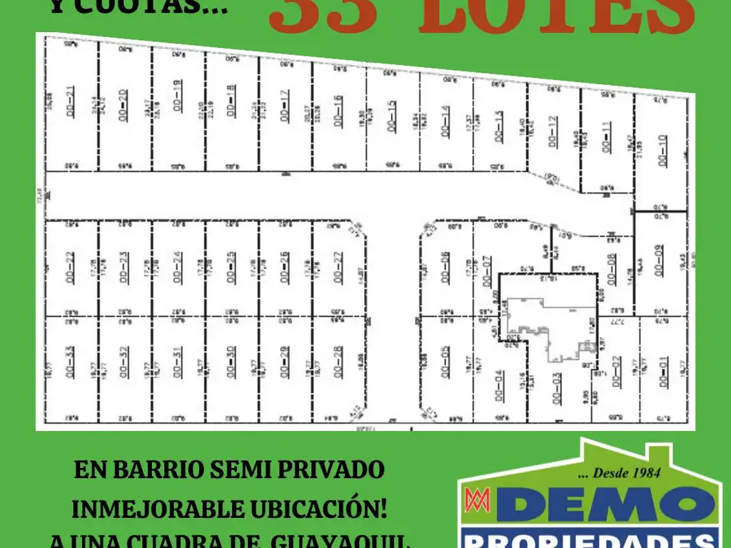 Loteo en Excelente ubicación totalmente perimetrado , a metros de Asfalto, a 1 cuadra de calle principal Guayaquil y Transporte publico, a 7 de Av. del Sesquicentenario ( Ruta 197) zona de Escuelas y Colegios, a 10 de Estación, Próximo a Centro Comercial.-