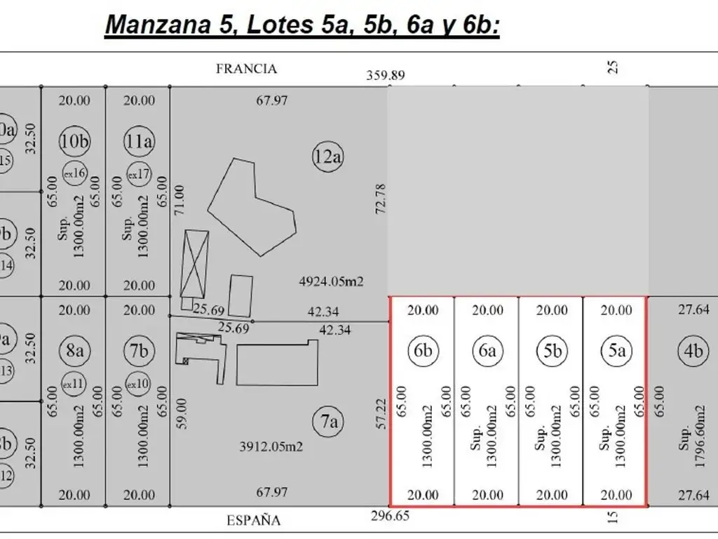 Manzana 5, lote 6b: 1.300,00 m2, frente 20m x 65m de fondo: u$s52.000.-