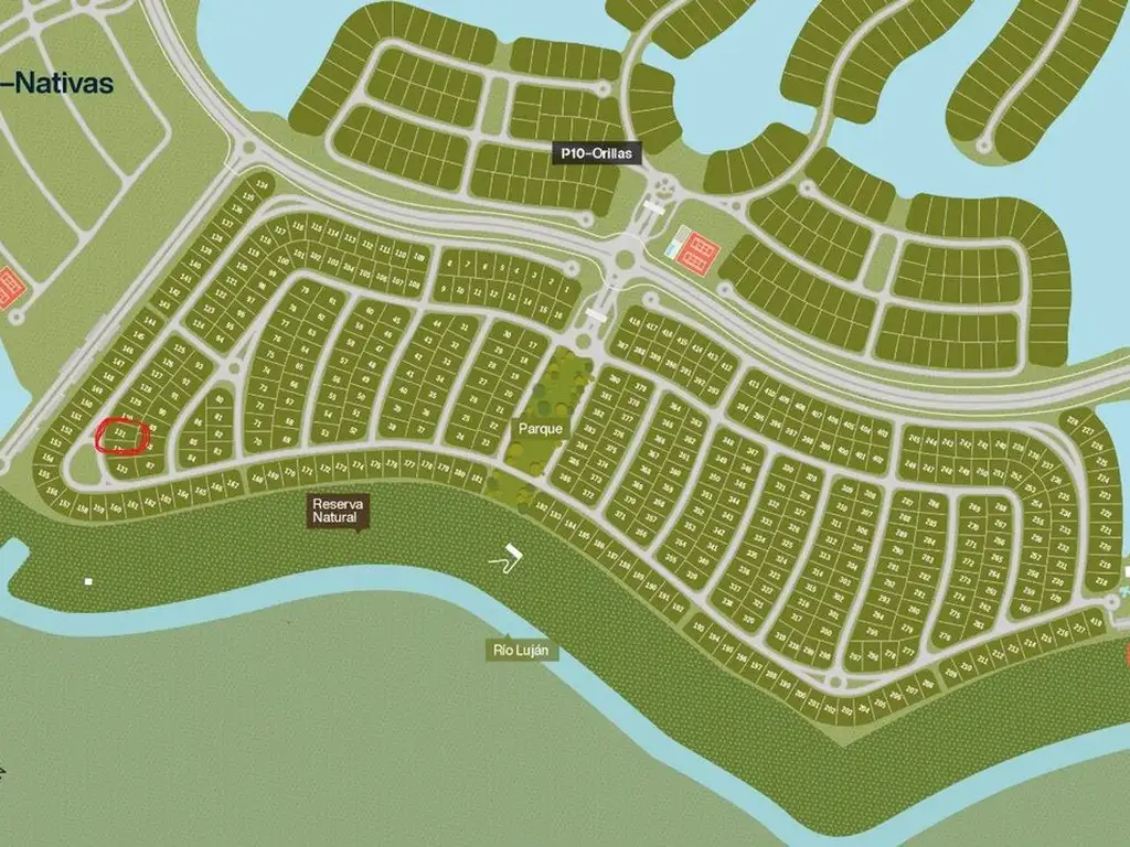 Nativas: › 419 lotes de 610 a 870 m2 › Acceso directo a la Reserva › Rápido acceso al río Luján › Parque central de una hectárea › Club house con salida al Lago Central.