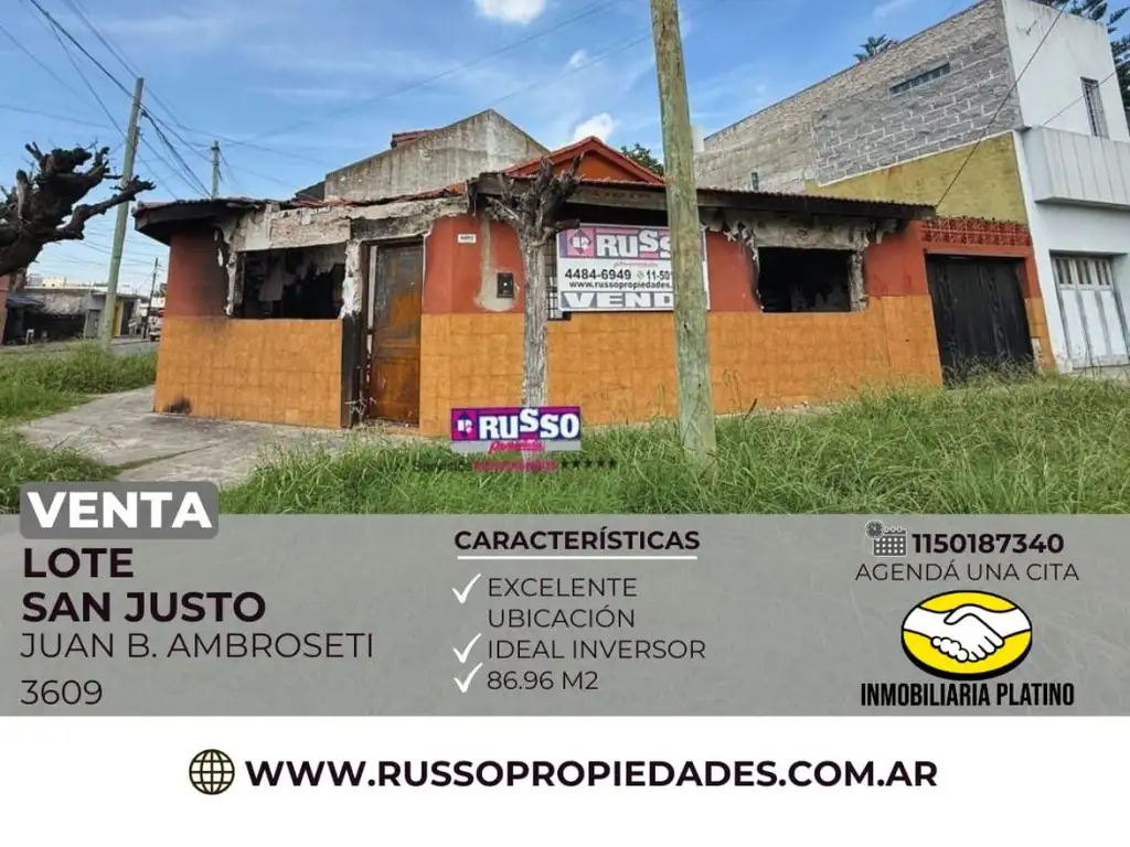 Se ofrece en venta un lote ubicado sobre la calle Juan B. Ambrosetti al 3600, entre Eizaguirre y Balbastro, en la localidad de San Justo, partido de La Matanza.